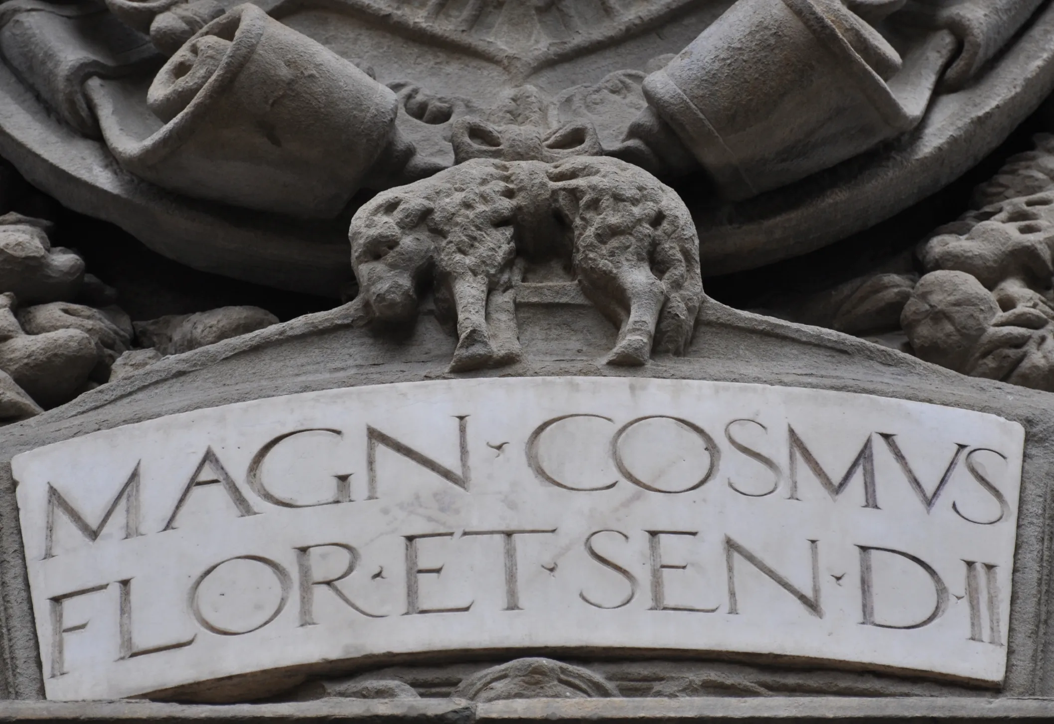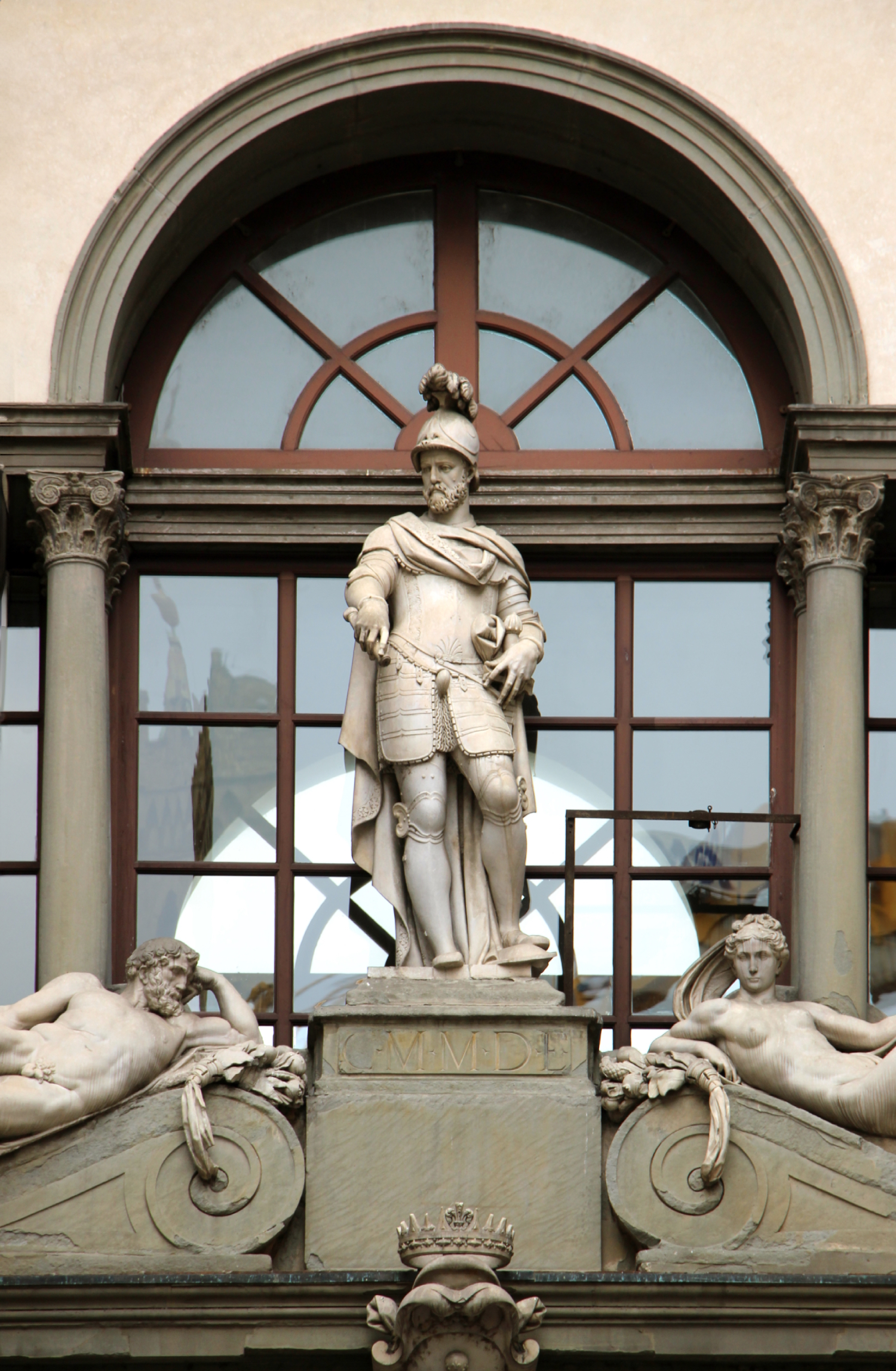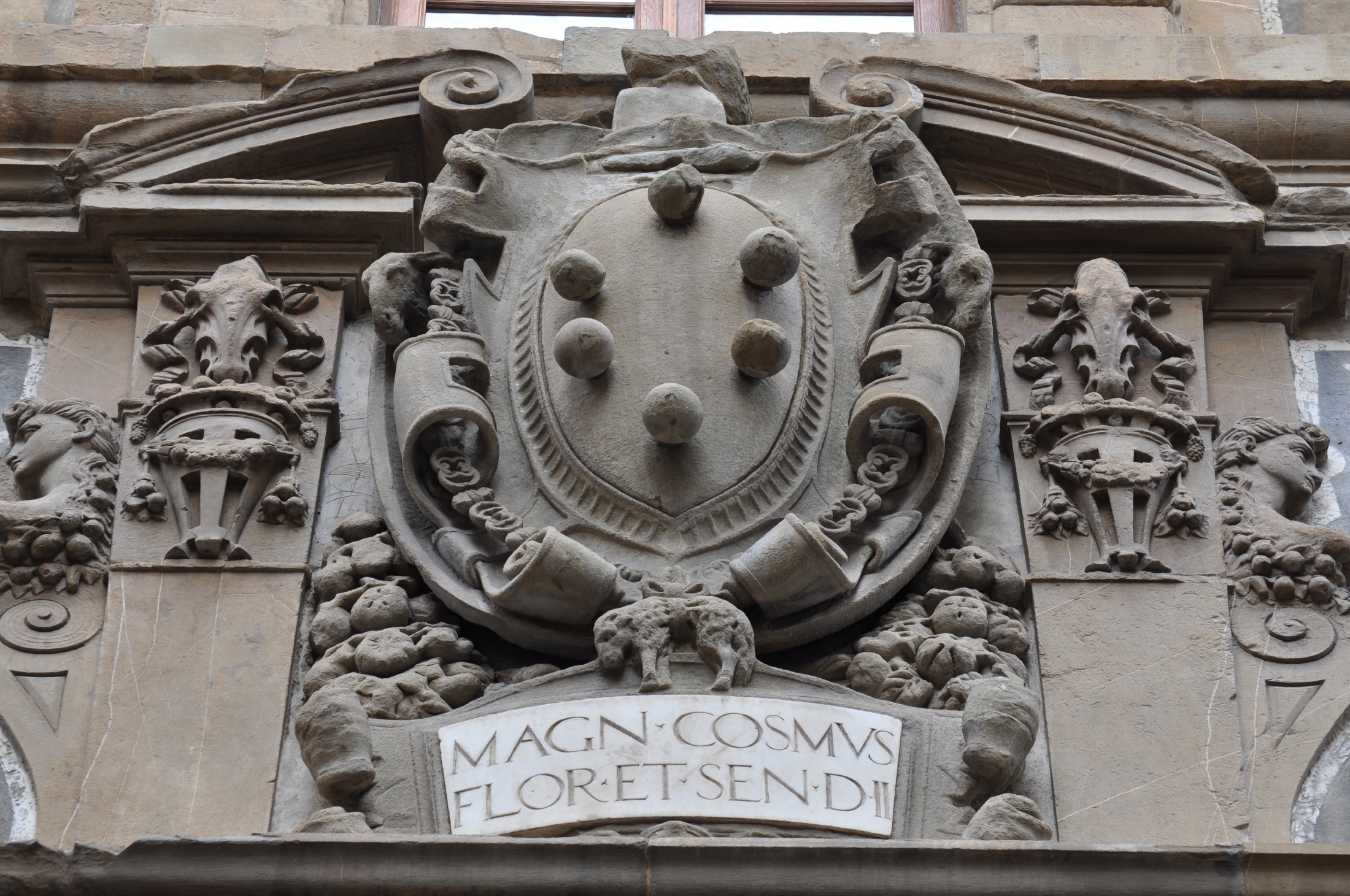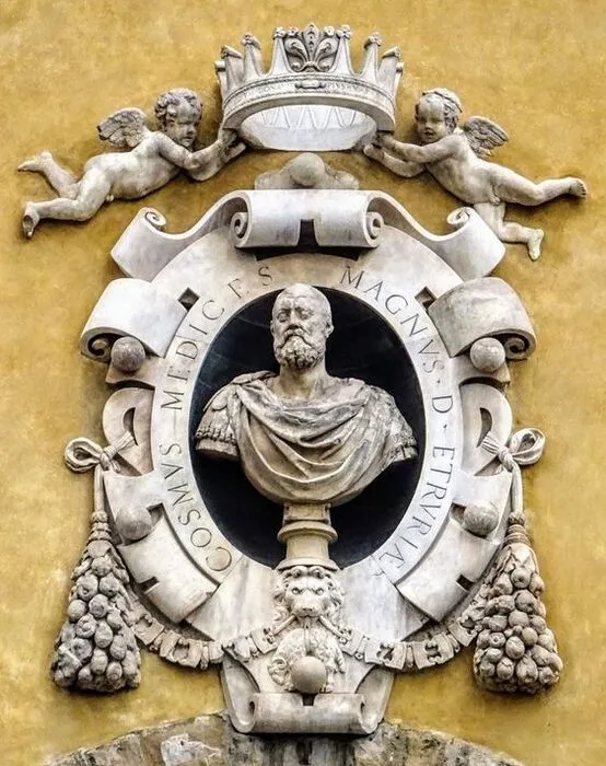 Bandini pushed the Medici balls into the outer frame, making space for an armored portrait bust in the Roman style. Above and below, he inserted Cosimo's newly upgraded crown and the Marzocco (Lion) of the now defunct Florentine Repuiblic.