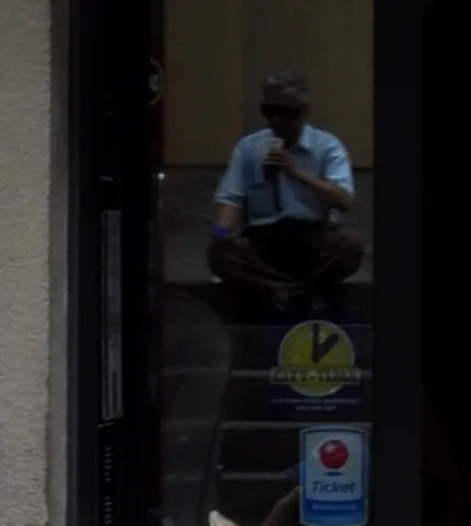 Reflected in the plate glass (upper left), someone from somewhere now reads his phone while slurping down a supersized drink.