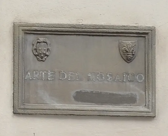 ARTE DEL MOSAICO = ART OF STONE INLAY, with the Medici Arms on the left and the giglio (lily) of the city of Florence on the right. (Photo Lyle Goldberg)