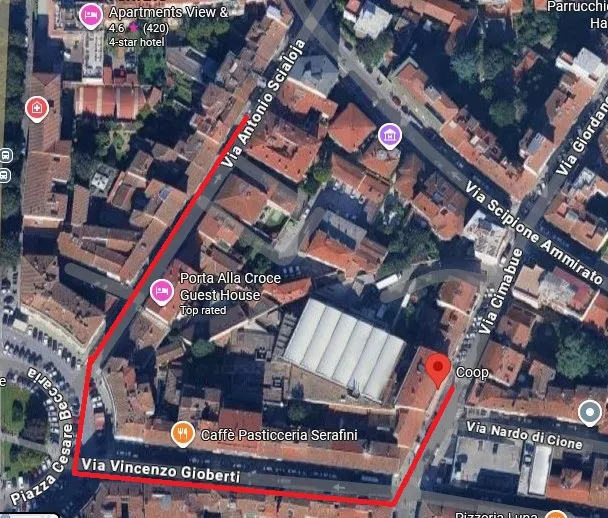 Tracing the red line from the upper left in Via Antonio Scialoia down to Piazza Cesare Beccaria (just a short jog), then along Via Vincenzo Gioberti and up Via Cimabue to the COOP.