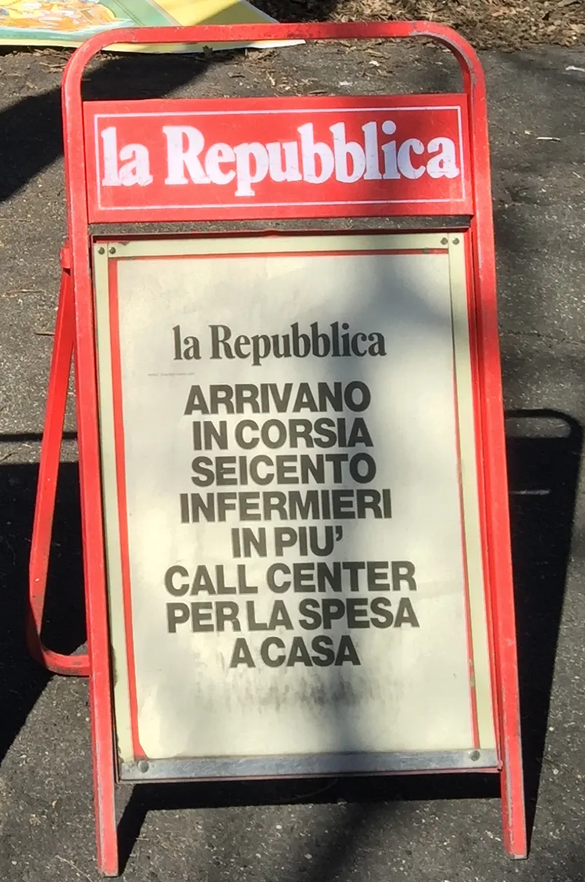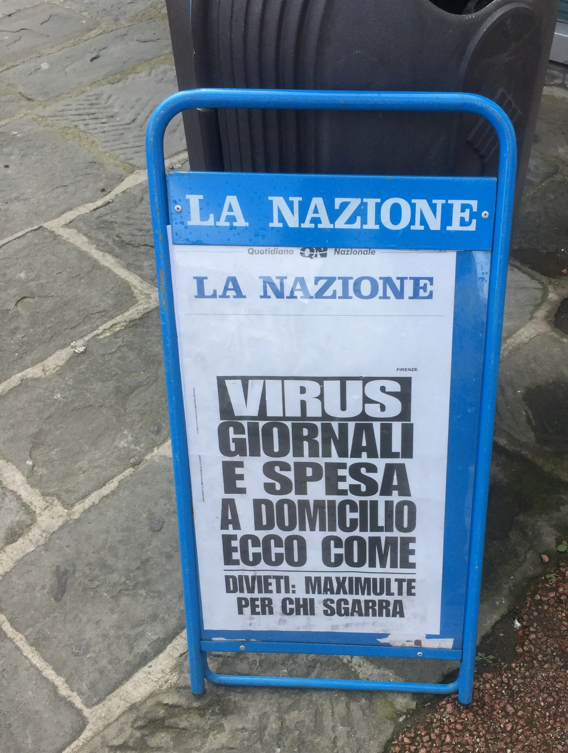 Newsstand placards, two from La Nazione, Florence's chief daily newspaper, one from La Repubblica. (March 21, 2020; Photo Edward Goldberg)