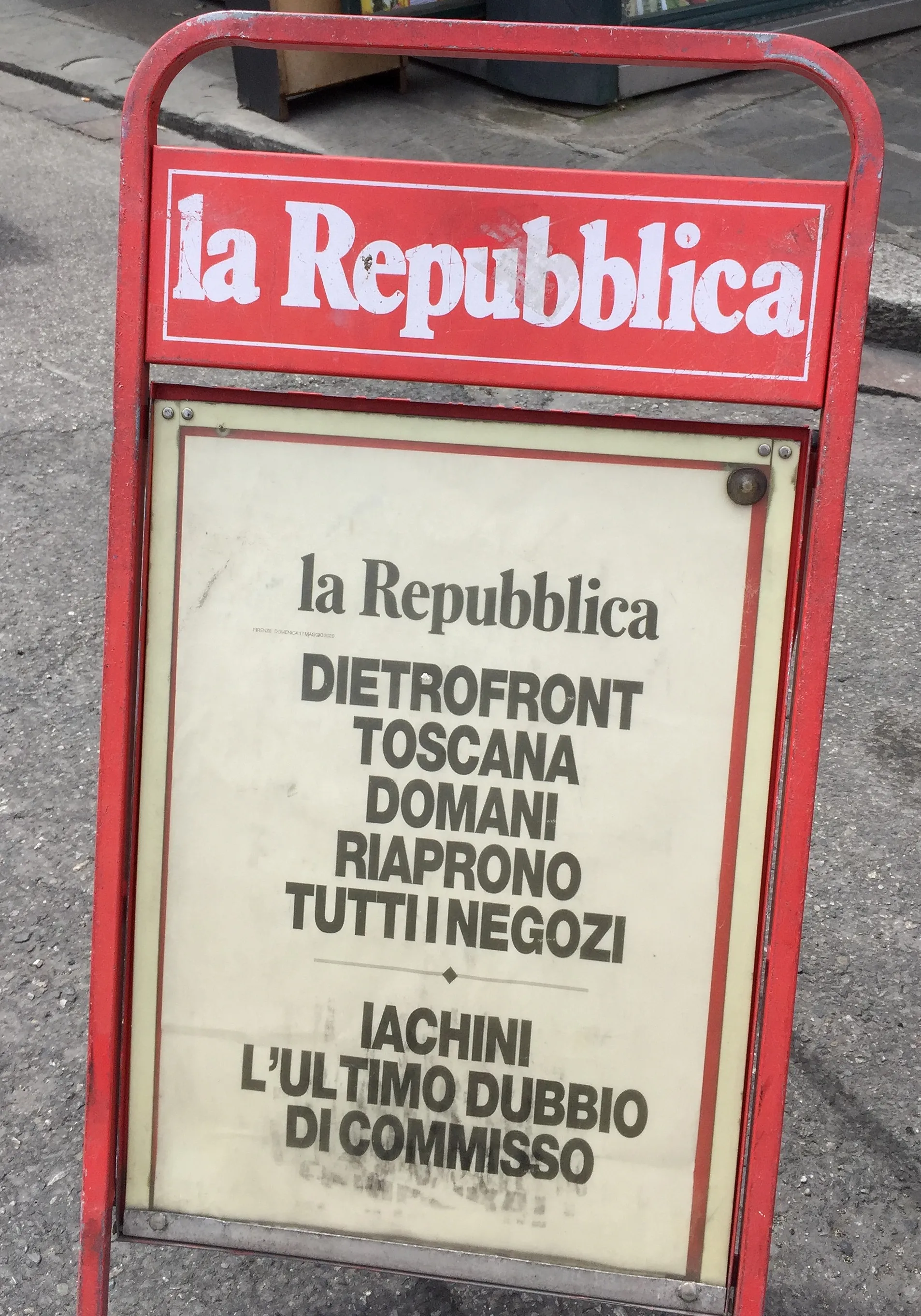 "Sudden Turn-Around in Tuscany; All the Shops Reopen Tomorrow" (May 17, 2020; Photo Edward Goldberg)