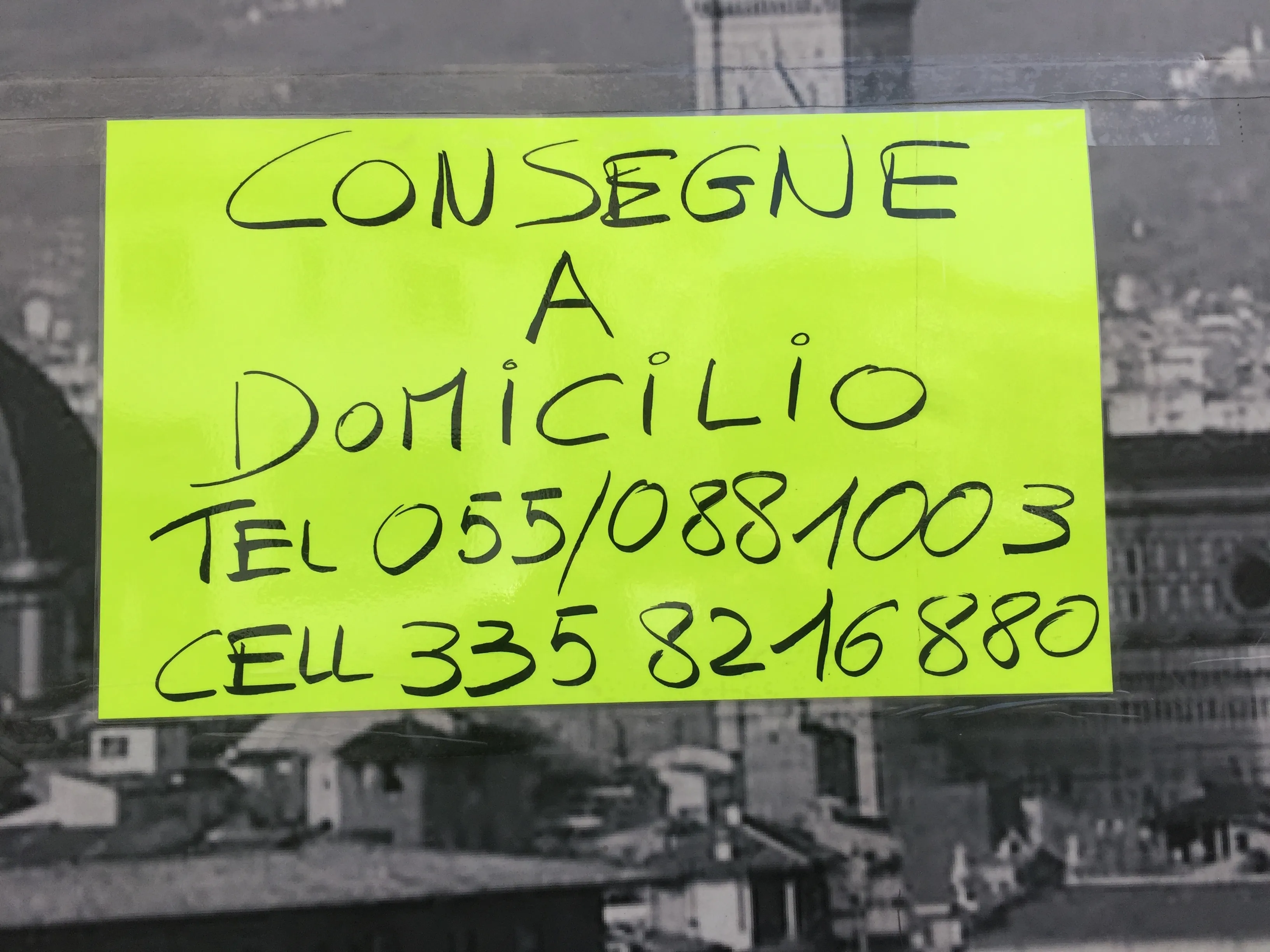 "(Below) CORONAVIRUS EMERGENCY: In keeping with the 1 March 2020 decree of the President of the Council of Ministers... (Above) We advise our clientele that we are offering free home delivery..." (April 22, 2020; Photo Edward Goldberg)