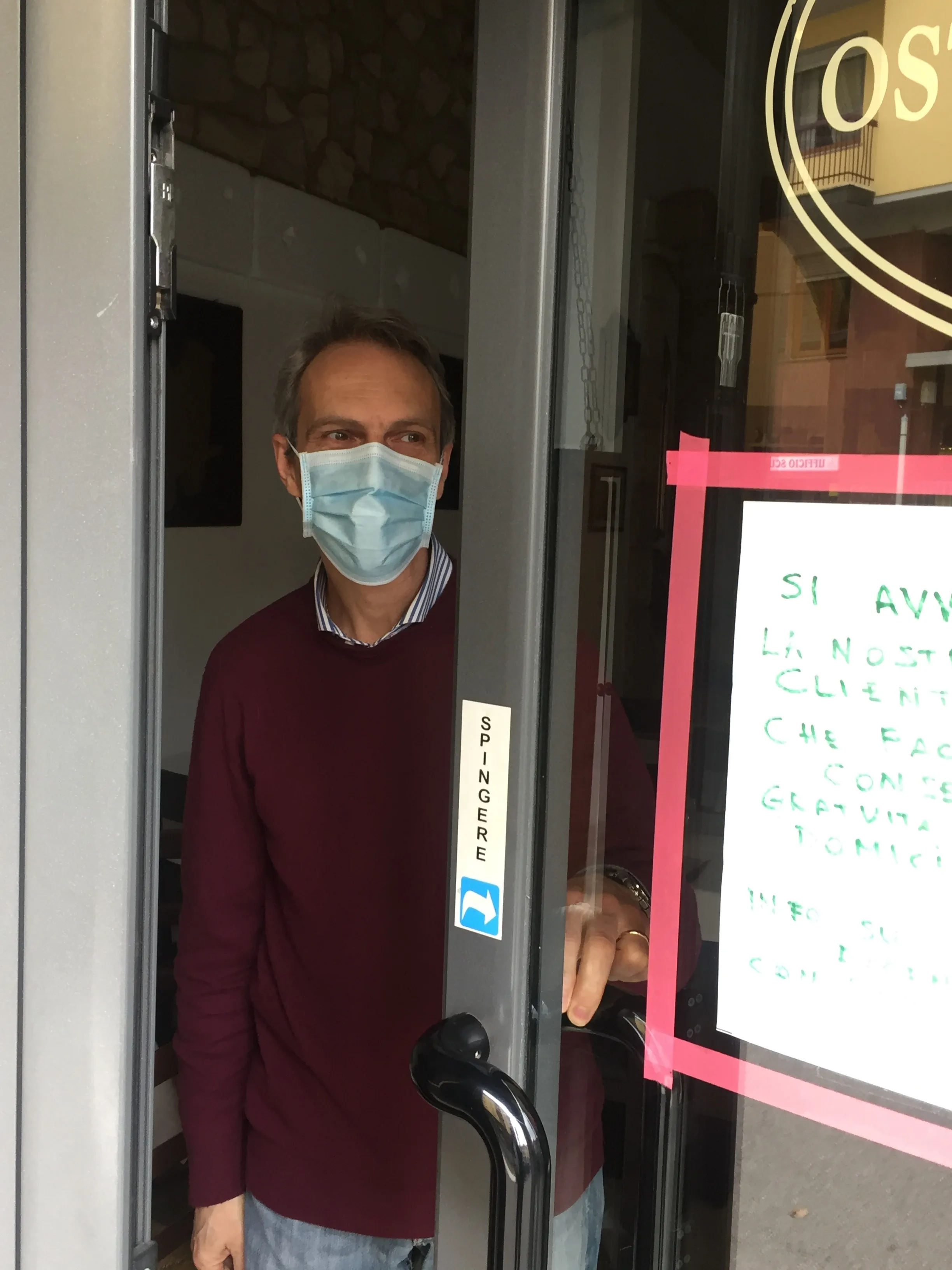 Paolo Nepi, masked proprietor of Il Sordo. (April 22, 2020; Photo Edward Goldberg)