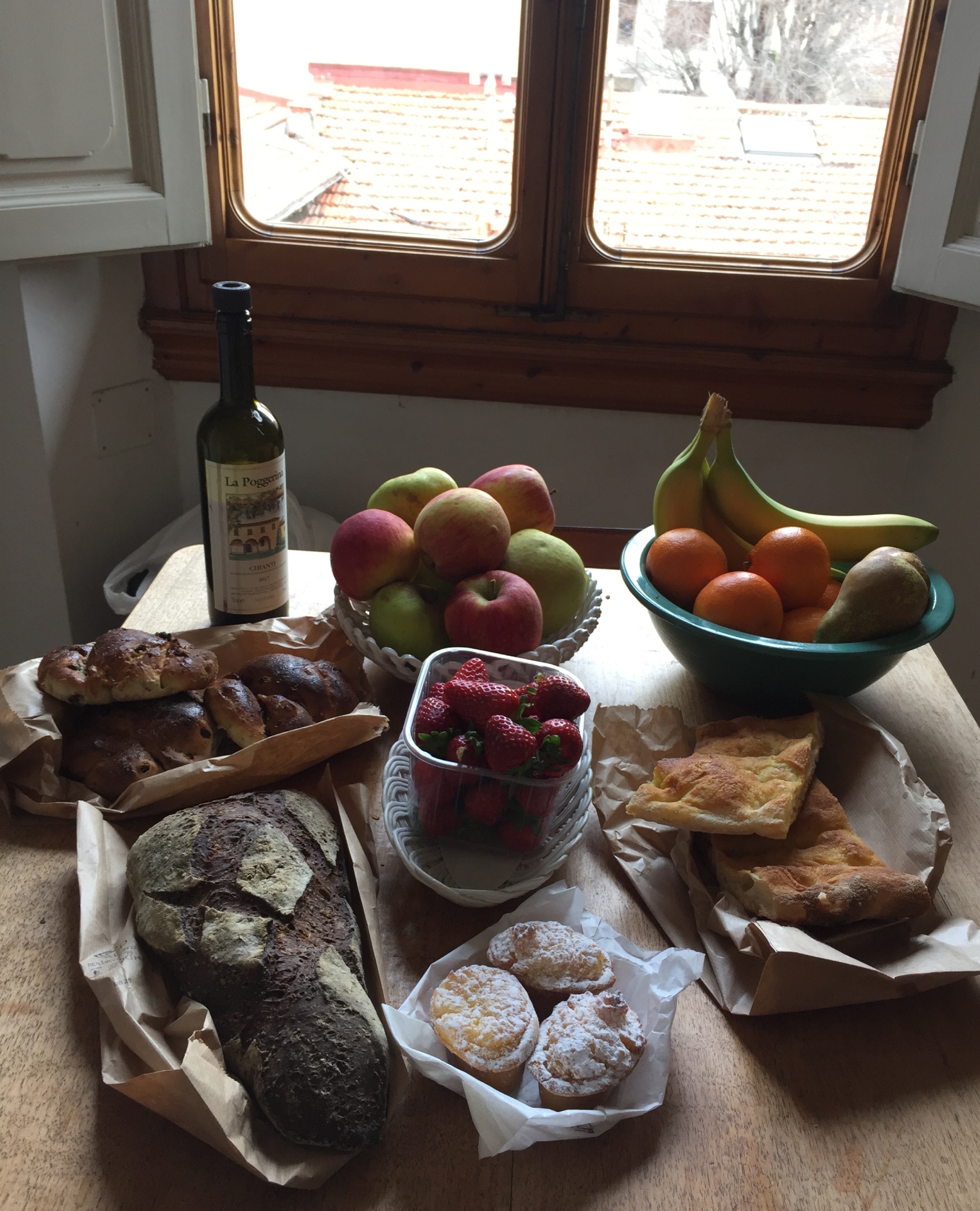 A mixed haul from the Mercato di Sant'Ambrogio and the nearby Forno Ghibellina. The bakery items, from the upper left counterclockwise. are: pani di ramerino (rosemarie buns with raisins), pane di segale nero (black rye bread) , budini di riso (rice pudding in pastry shells) and schiacciata all'olio (no Florentine says "focaccia"). March 13, 2020; Photo Edward Goldberg)
