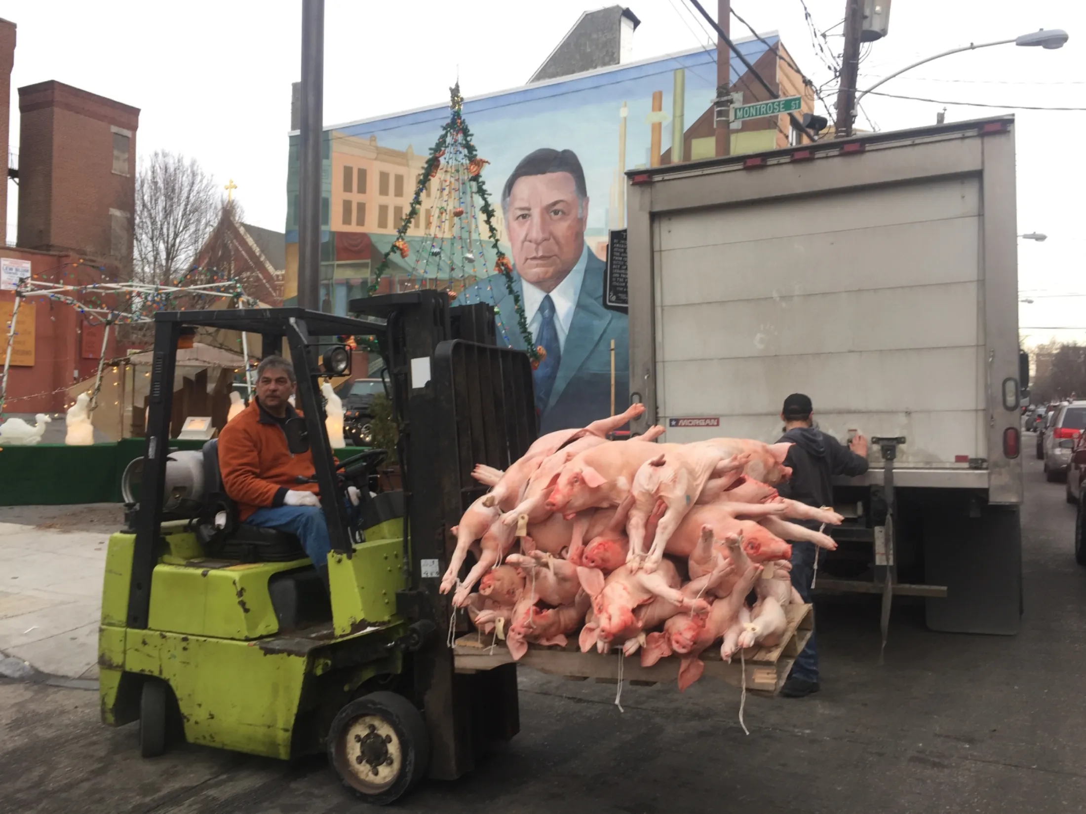 Christmas in the Italian Market in Philadelphia in the 2010s. The late Frank Rizzo does his bit for holiday cheer. The mural was realized by artist Diane Keller in 1995 and removed on June 7, 2020 in the midst of the Black Lives Matter turmoil. It had already achieved notoriety as the most frequently vandalized work of public art in the city. (Photo Lyle Goldberg)