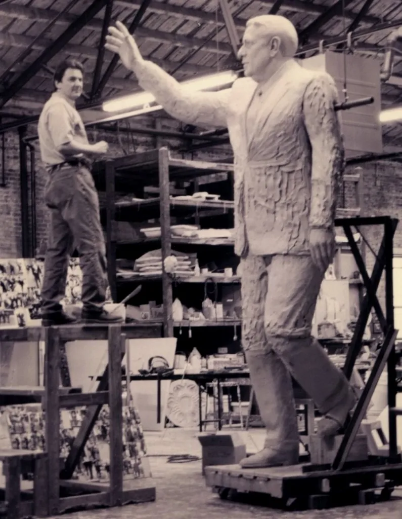 The sculptor at work on the model from which the monumental bronze will be cast. His visual source was a photo of the late mayor (died 1991) waving at a parade. The statue was installed in late 1998 and unveiled on January 1, 1999.