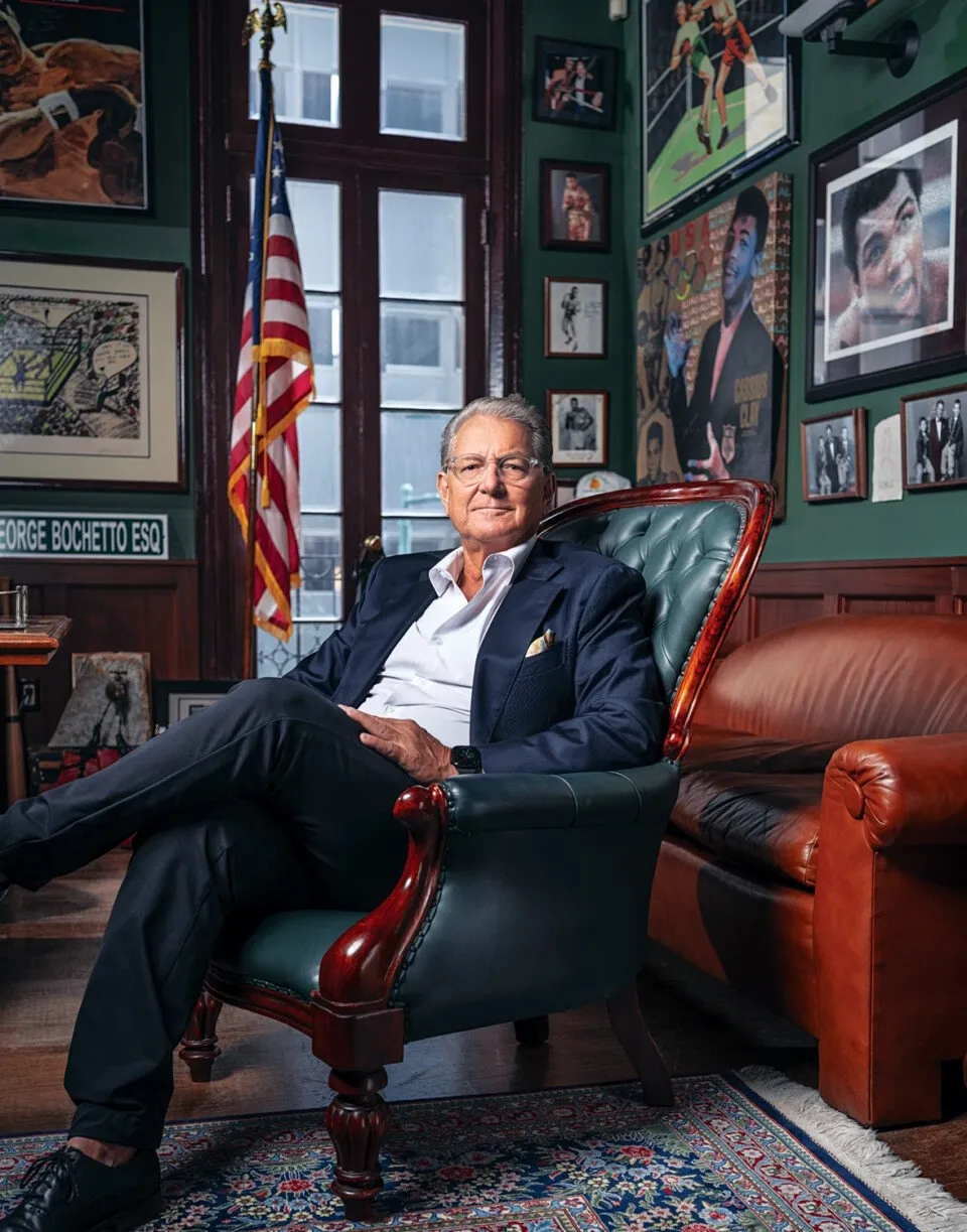George Bochetto in his imposing Center City Philadelphia law office surrounded by boxing memorabilia. He served as Pennsylvania Boxing Commissioner from 1995 to 2002.