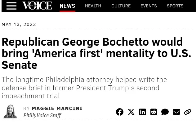 George Bocchetto launched an expensive self-funded Senate race. (PhillyVoice, May13, 2022) Ultimately, he came in seventh in the Republican Primary, with 1.1% of that party's vote. In 1998, he made a hastily truncated run for mayor.
