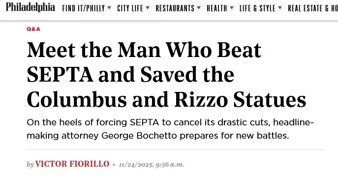 George Bochetto's profile in Philadelphia Magazine (November 24, 2025). The SEPTA (Southeastern Pennsylvania Transit Authority) case was another major victory for this "headline making attorney".
