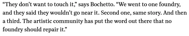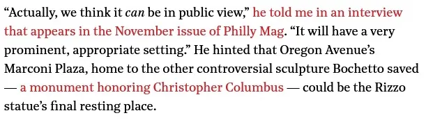 Attorney Bochetto might seem to be veering into a "Woke Mob" conspiracy theory but he is not entirely wrong about the "artistic community", as explicated by the author of the Rizzo statue himself. (Frudakis describes himself as politically "to the left of Bernie Sanders").