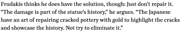 Then there were the statues themselves. Unlike the Zenos Frudakis bronze, the Emanuele Caroni marble was 150 years old and could make a plausible case for being a work of art.